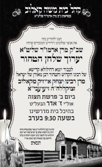 היינט נאכט ז' אדר געפאלט די יומא דהילולא קדישא פון הרה"ק רבי אייזיק'ל קאלובער זי"ע, נכדו כ"ק אדמו"ר מקאלוב שליט"א וועט אפרעכטן די יארצייט טיש היינט אויפדערנאכט אין ביהמ"ד קאלוב אין וויליאמסבורג.