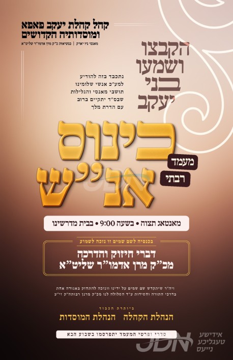 היינט קומט פאר א גרויסער כינוס פאר כלל חסידי פאפא אין מאנסי, וואו כ"ק אדמו"ר מפאפא שליט"א וועט אויפטרעטן מיט דברי חיזוק והדרכה, די כינוס קומט פאר אין ביהמ"ד פאפא אין מאנסי.