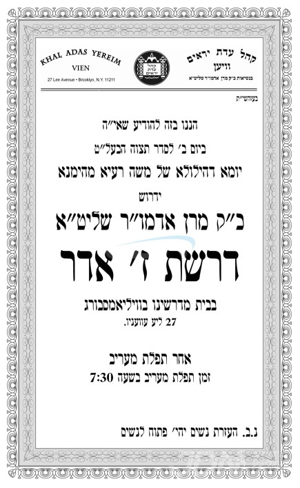 כ"ק אדמו"ר מוויען שליט"א וועט היינט אויפדערנאכט אויפטרעטן מיט די יערליכע ז' אדר דרשה כנהוג, אין ביהמ"ד הגדול קהל עדת יראים וויען אין וויליאמסבורג.