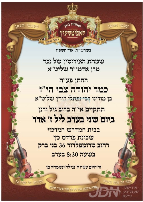 שמחת בית קאפיטשניץ: היינט קומט פאר די שמחת התנאים פון א אייניקל ביי כ"ק אדמו"ר מקאפיטשניץ שליט"א, די חתן א זון פון זיין זון הגה"צ ר' נפתלי הירץ פלינטנשטיין שליט"א יו"ר מכון שפתי צדיקים, איידעם ביי כ"ק אדמו"ר מסטרעטין זצ"ל, מיט די כלה א טאכטער פון הגה"צ ר' אברהם ענגלארד שליט"א, זון פון הגה"צ אבד"ק דאברא זצ"ל, און איידעם ביי הגה"צ ר' אהרן שפירא שליט"א גאב"ד פרדס כץ. – די שמחה קומט פאר אין ביהמ"ד המרכזי אין פרדס כץ געגנט אין בני ברק.