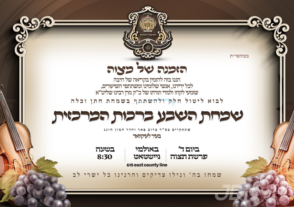 שמחת בית בלאזוב ריבאטיטש: היינט קומט פאר די שמחת השבע ברכות פון די כלה א טאכטער ביי כ"ק אדמו"ר מבלאזוב ריבאטיטש שליט"א, איידעם ביי הרה"ג ר' שאול קנאבלאך שליט"א ר"ם במתיבתא עץ חיים ד'באבוב, מיט די חתן א זון פון הרב נטע פריעדמאן שליט"א, זון פון הגה"צ ר' שמעלקא פריעדמאן שליט"א דומ"ץ התאחדות הרבנים, און איידעם ביי הגה"צ ר' ברוך חנה גרינפעלד שליט"א רו"ם באבוב 45 אין לאנדאן. – די שמחת השבע ברכות קומט פאר אין די נייע זאל פון ת"ת סקווירא אין לעיקוואד, צוגעשטעלט דורך ק"ק בלאזוב ריבאטיטש.