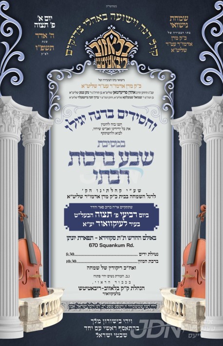 היינט קומט פאר די שמחת השבע ברכות פונעם חתן א זון פון כ"ק אדמו"ר מסקולען שליט"א פון וויליאמסבורג, מיט די כלה א טאכטער פון הגה"צ ר' יעקב יוסף גאלדמאן שליט"א דומ"ץ ביהמ"ד סקווירא אויף ראמען אין מאנסי, זון פון הגה"צ ר' שמואל גאלדמאן שליט"א מזוועהיל, און איידעם ביי הגה"צ ר' יוחנן וואזנער שליט"א ראב"ד סקווירא. – די שמחת השבע ברכות קומט פאר אין סקווירא בית המדרש אויף ראמען אין מאנסי.