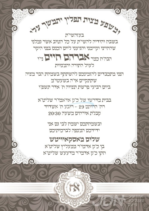 היינט קומט פאר די שמחת הבר מצוה פון א אייניקל ביי כ"ק אדמו"ר ממעליץ שליט"א, א זון פון זיין זון הגה"צ ר' שלום מאסקאוויטש שליט"א, איידעם ביי כ"ק אדמו"ר מדעעש שליט"א. – די שמחה קומט פאר אין ביהמ"ד מעליץ אין אשדוד.