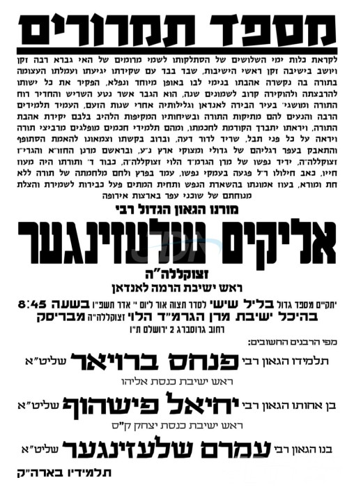 היינט קומט פאר אן עצרת הספד נאך די הסתלקות פון הגאון הגדול רבי אליקים שלעזינגער זצ"ל ראש ישיבת הרמה לאנדאן, בהיכל ישיבת מרן הגרמ"ד הלוי מבריסק אויף רחוב גראסבערג אין ירושלים.