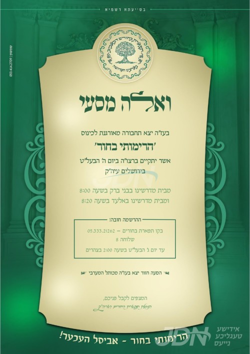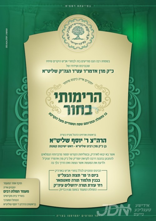 עס איז געשלאסן געווארן די שידוך פונעם חתן א זון פון הגה"צ ר' יוסף מאיר פעלדמאן שליט"א, זון פון הגה"צ ר' זאב פעלדמאן שליט"א רב דקהל תורה עץ חיים אין לאנדאן, און איידעם ביי הגה"צ ר' מרדכי אויערבאך שליט"א אבד"ק אביר יעקב תל אביב, מיט די כלה א טאכטער פון הגה"צ ר' מנחם שלמה בורנשטיין שליט"א, זון פון כ"ק אדמו"ר מסוכוטשוב שליט"א, און איידעם ביי כ"ק אדמו"ר מטריסק שליט"א פון ירושלים.