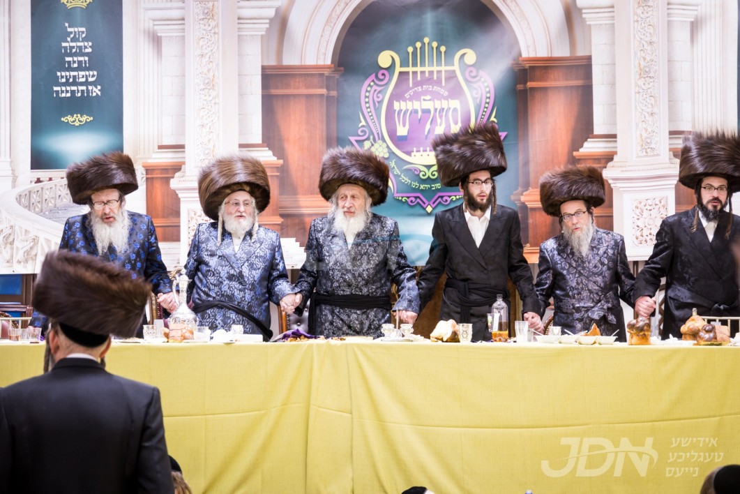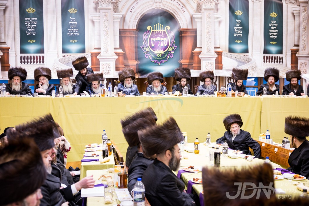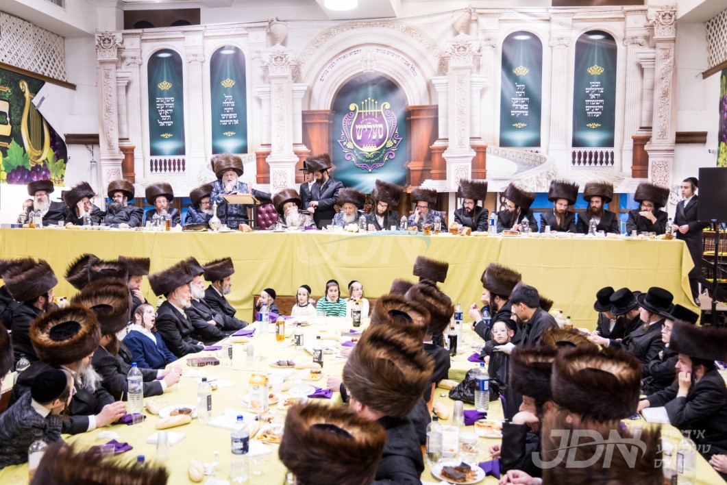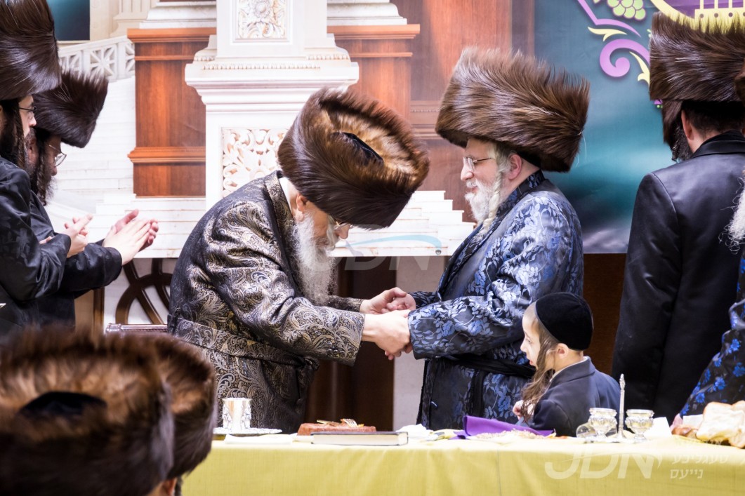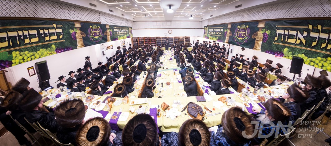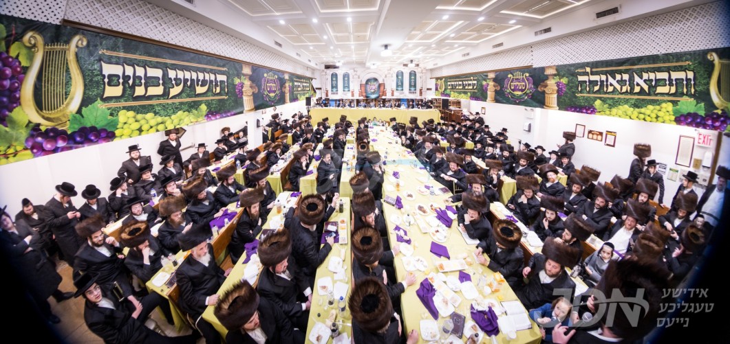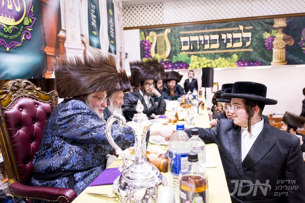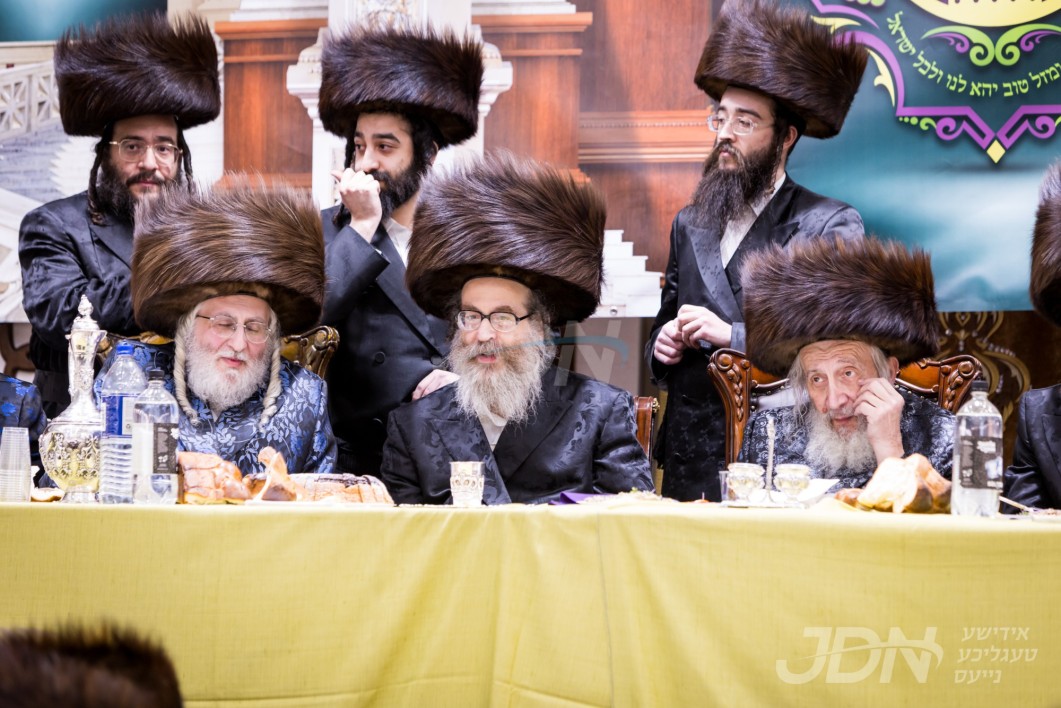 שמחת השבע ברכות פון החתן בן אבד"ק פינטשוב מיט הכלה אור אייניקל פון האדמו"ר מסאטמאר, אין ביהמ"ד דאמבראווא