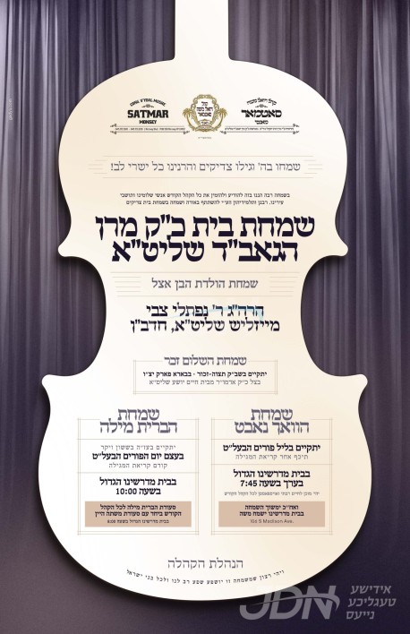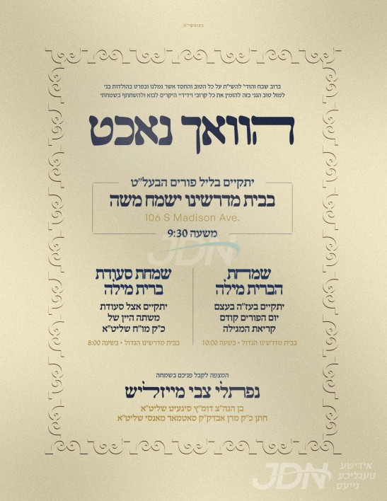 היינט אויפדערנאכט ליל פורים קומט פאר די שמחת הוואכנאכט פון א אייניקל ביי כ"ק גאב"ד סאטמאר מאנסי שליט"א, בנו יחידו פון כ"ק אדמו"ר מבית חיים יהושע שליט"א, בן הנולד ביי זיין איידעם הגה"צ ר' נפתלי צבי מייזליש שליט"א רב ביהמ"ד ישמח משה ד'סאטמאר מאנסי, זון פון הגה"צ ר' פנחס מרדכי מייזליש שליט"א דומ"ץ קהל יראים סיגעיט. – די שמחת הוואכנאכט קומט פאר אין ביהמ"ד ישמח משה ד'סאטמאר אין מאנסי, און די שמחת הברית בעצם יום הפורים אין ביהמ"ד הגדול סאטמאר אין מאנסי, נאכגעפאלגט מיט די סעודת ברית ביים משתה היין טיש אין ביהמ"ד הגדול.
