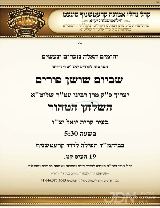 מיטוואך שושן פורים וועט כ"ק אדמו"ר מקרעטשניף סיגעט וומס"ב שליט"א אנקומען קיין קרית יואל, און אפרעכטן די שושן פורים טיש ברוב עם אין ביהמ"ד תפלה לדוד קרעטשניף אויף העיס קאורט.