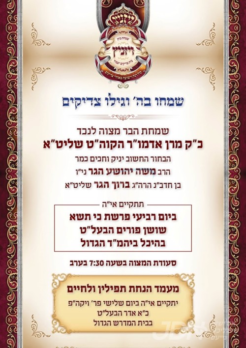 היינט אויפדערנאכט ליל פורים קומט פאר די שמחת הבר מצוה פון א אייניקל ביי כ"ק אדמו"ר מסאסוב שליט"א, א זון פון זיין זון הגה"צ ר' ישראל טייטלבוים שליט"א, איידעם ביי כ"ק אדמו"ר מדעעש ירושלים שליט"א. – די שמחה קומט פאר אין ביהמ"ד סאסוב אין קרית ישמח משה, אינאיינעם מיטן שולה"ט לכבוד החג.