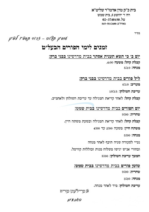 היינט אויפדערנאכט ליל פורים וועט כ"ק אדמו"ר מוויזניץ שליט"א פון בית שמש אנקומען קיין בני ברק, און פראווענען דעם סדר הלילה, קריאת המגילה און די טיש שפעטער ביינאכט, בבית מדרשו אויף רחוב מלצר.