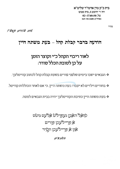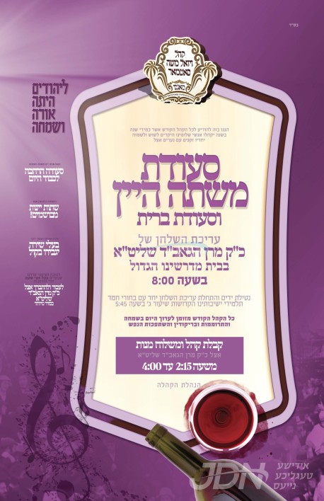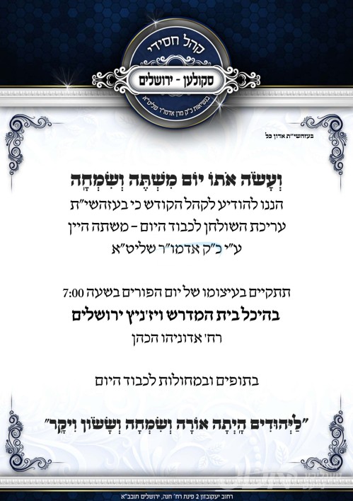 מיטוואך בעצם יום הפורים דמוקפין וועט כ"ק אדמו"ר מסקולען שליט"א פון ירושלים אפרעכטן דעם טיש משתה היין, אין ביהמ"ד הגדול וויזניץ אויף רחוב אדוניהו הכהן אין ירושלים.