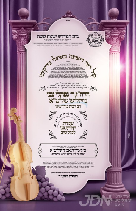 שמחת בית ראחמיסטריווקא – ספינקא – סטריזוב – ציעשנוב – בערטש: עס איז געשלאסן געווארן די שידוך פון א אייניקל ביי כ"ק אדמו"ר מראחמיסטריווקא שליט"א, די חתן א זון פון זיין איידעם הגה"צ ר' נפתלי אברהם אביש ווייס שליט"א, זון פון כ"ק אדמו"ר מספינקא שליט"א, מיט די כלה א טאכטער פון הגה"צ ר' מנחם מענדיל אייכענשטיין שליט"א, זון פון הגה"צ אבד"ק בערטש שליט"א, און איידעם ביי הגה"צ אבד"ק ציעשנוב שליט"א, איידעם ביי כ"ק אדמו"ר מסטריזוב שליט"א.