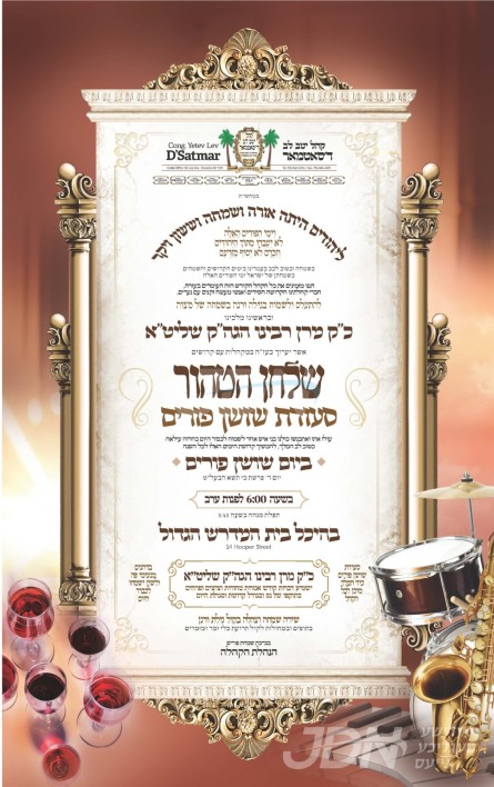 מארגן דינסטאג בעצם יום הפורים וועט כ"ק גאב"ד וואודרידזש שליט"א ווי יאר יערליך אנקומען קיין וויליאמסבורג, און פראווענען דעם סעודת משתה היין אינאיינעם מיט חסידיו ומעריציו, אין שטוב פון הנגיד החסיד ר' געציל זופניק הי"ו.