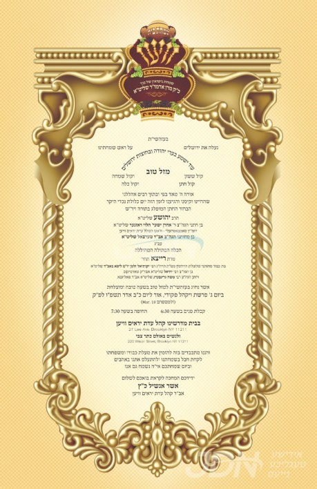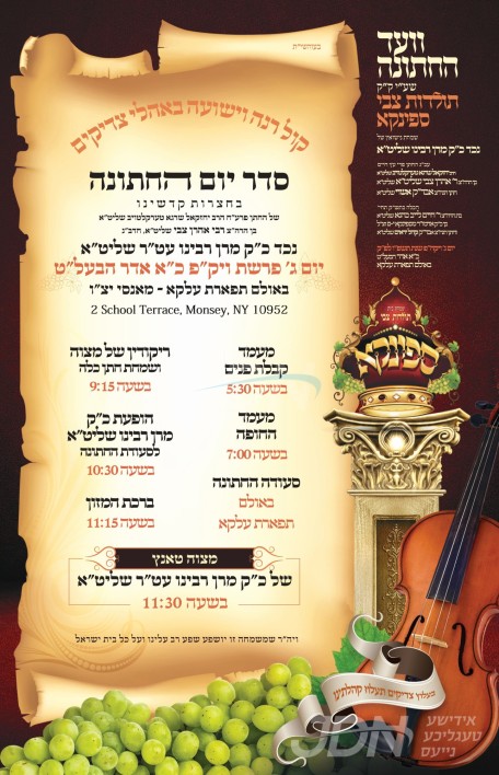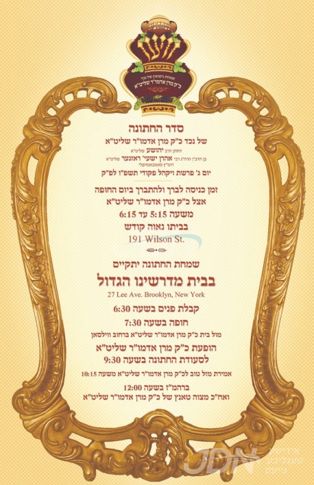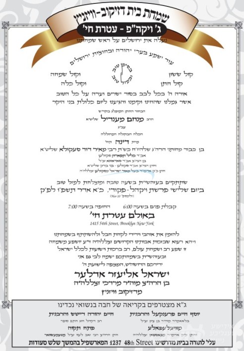 היינט קומט פאר די שמחת החתונה פונעם חתן א זון פון הגה"צ ר' ישראל אליעזר אדלער שליט"א אדמו"ר מדזיקוב וויזניץ ב"פ, איידעם ביי כ"ק אדמו"ר מוויעליפאלי שליט"א, מיט די כלה א טאכטער פון הגה"צ ר' מאיר דוד סעקולא שליט"א אבד"ק כליל תפארת סקולען ב"פ, זון פון הגה"צ אבד"ק סאדאוונא זצ"ל, און איידעם ביי הגה"צ אבד"ק סקולען ב"ב שליט"א. – די שמחת החתונה קומט פאר אין זאל עטרת חי' אין בארא פארק.