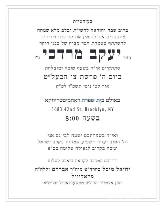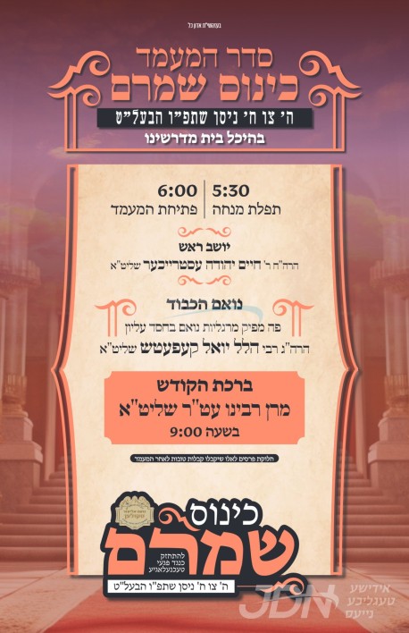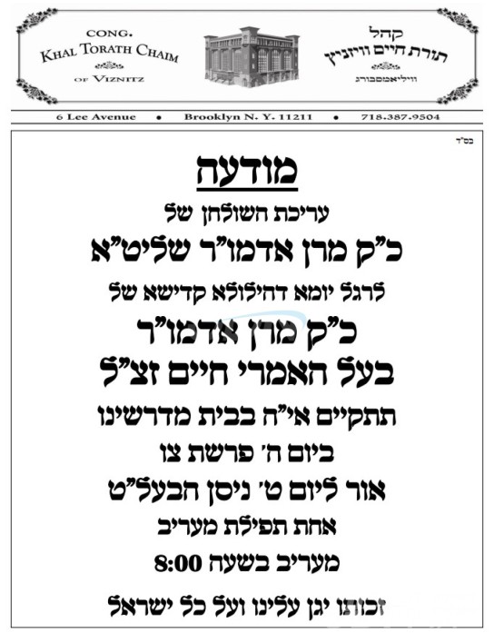 היינט קומט פאר די שמחת הברית פון א אייניקל ביי כ"ק אדמו"ר מבית יצחק ספינקא שליט"א, אייניקל פון זיין זון הגה"צ ר' אשר יונה הורוויץ שליט"א, איידעם ביי הגה"צ ר' בערל בעק שליט"א אב"ד מאדא, בן הנולד ביי זיין איידעם הרב נחמן כהנא שליט"א, זון פון הגה"צ ר' יצחק אייזיק כהנא שליט"א מספינקא. – די שמחה קומט פאר אין ספינקא ביהמ"ד אויף קיעפ סטריט אין וויליאמסבורג.