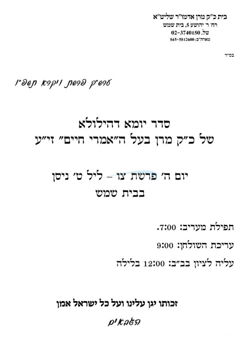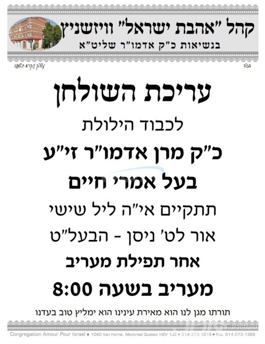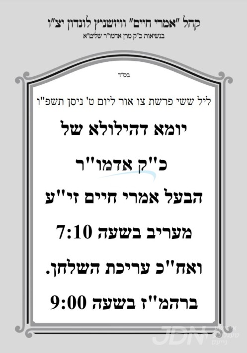 היינט נאכט ט' ניסן געפאלט די יומא דהילולא קדישא פון כ"ק אדמו"ר הרה"ק בעל אמרי חיים מוויזניץ זצ"ל, פילע אידן וועלן פוקד זיין דעם ציון הק' אויפן וויזניצע בית החיים אין בני ברק להיפקד בדבר ישועה ורחמים, די אייניקלעך כ"ק האדמורי"ם שליט"א לבית וויזניץ וועלן אפרעכטן די יארצייט טישן ברוב עם.