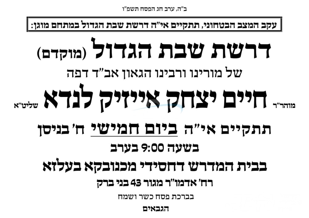 היינט קומט פאר די יערליכע שבת הגדול דרשה דורך הגה"צ רבי חיים יצחק אייזיק לאנדא שליט"א גאב"ד בני ברק, אין ביהמ"ד הגדול מאחנובקא בעלזא אין בני ברק.