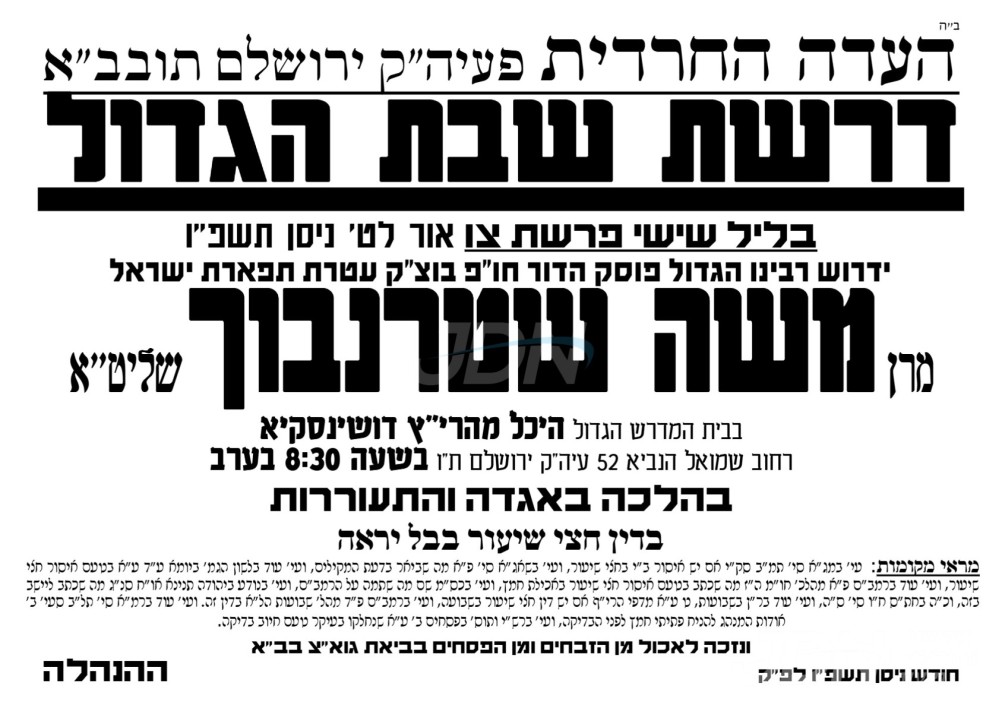 היינט קומט פאר די יערליכע שבת הגדול דרשה דורכ'ן פוסק הדור מרא דארעא קדישא שליט"א, אין ביהמ"ד הגדול דושינסקיא אין ירושלים עיה"ק.