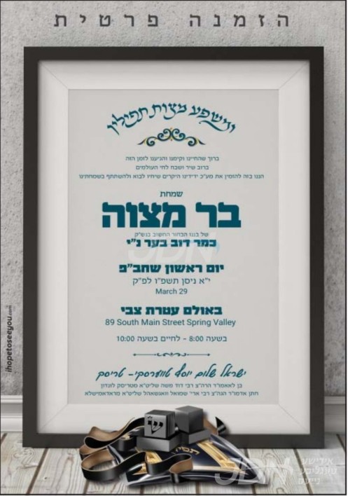 היינט קומט פאר די שמחת הבר מצוה פון א זון ביי הגה"צ ר' ישראל שלום יוסף טווערסקי שליט"א אב"ד טריסק מאנסי, זון פון הגה"צ ר' דוד משה טווערסקי שליט"א מטריסק לאנדאן, און איידעם ביי הגה"צ ר' ארי' וואגשאהל שליט"א אבד"ק שפתי יצחק ראדאמישלא מאנסי. – די שמחה קומט פאר אין זאל עטרת צבי אין מאנסי.