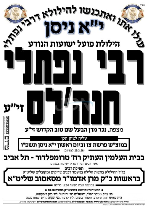 פילע אידן וועלן היינט פוקד זיין דעם ציון פונעם באקאנטן פועל ישועות רבי נפתלי חנה'לעס זי"ע אייניקל פון בעל שם טוב הק' זי"ע, לרגל די יארצייט וואס געפאלט היינט י"א ניסן, אויפן אלטן בית עלמין אויף רחוב טרומפלדור אין תל אביב.