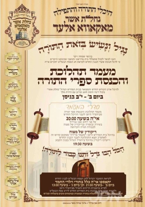 היינט קומט פאר די מעמד תהלוכת והכנסת ספרי תורה צום נייעם ביהמ"ד נחלת אשר מאקאווא אלעד, פונעם אלטן בית המדרש אויף רחוב אבן גבירול.