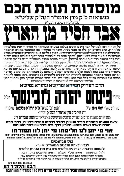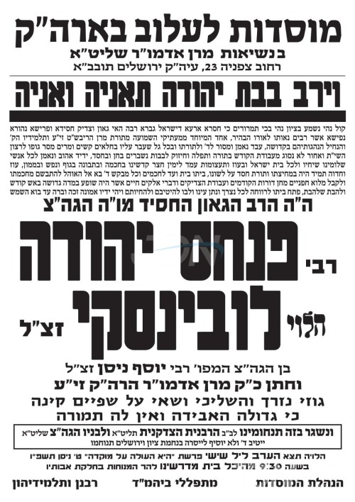 נאך די פטירה פון הגה"צ ר' פנחס יהודה לובינסקי זצ"ל, חתנא דבי נשיאה פון כ"ק אדמו"ר הרה"ק רבי אברהם שלמה מלעלוב זצ"ל, זיצן שבעה די בני המשפחה אין ישיבת טשערנאביל אויף רחוב מעגלי הרי"ם לוין אין סנהדריה המורחבת אין ירושלים.