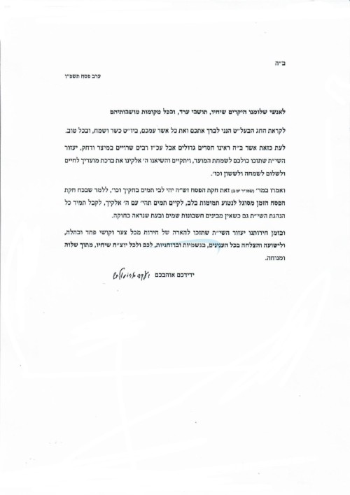 טראץ וואס אין גור איז דאס א זעלטנהייט, האט דער רבי שליט"א אפגעשיקט דעם ספעציעלן חיזוק בריוו אונטערגעשריבן בכתב יד קדשו, וואו דער רבי טוט וואונטשן אנשי שלומו היקרים צום פרייליכן יו"ט פסח, אתכם ואת כל אשר עמכם, א כשר'ן און פרייליכן יום טוב און אלעס גוטס.