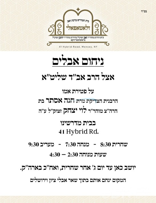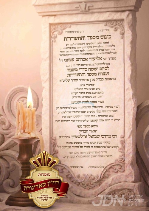 היינט קומט פאר א כינוס מספיד והתעוררות אין ביהמ"ד הגדול סאדיגורא אין בני ברק, ככלות השלושים נאך די פטירה פון הרב החסיד ר' אליעזר אברהם עציוני ע"ה, אין שפיץ פון כ"ק אדמו"ר מסאדיגורא שליט"א.