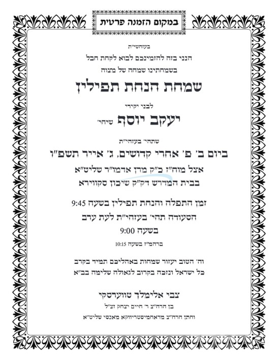שמחת בית סקווירא – ראחמיסטריווקא: היינט קומט פאר די שמחת הנחת תפילין פון א אור אייניקל ביי כ"ק אדמו"ר מסקווירא שליט"א, אייניקל פון זיין איידעם כ"ק אדמו"ר מראחמיסטריווקא מאנסי שליט"א, א זון פון זיין איידעם הרב צבי אלימלך טווערסקי שליט"א, זון פון הגה"צ ר' חיים יצחק טווערסקי זצ"ל מלויעוו טשערנאביל. – די שמחה קומט פאר אין ביהמ"ד הגדול אין שיכון סקווירא.