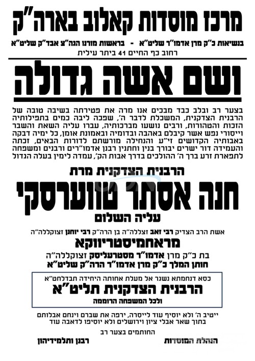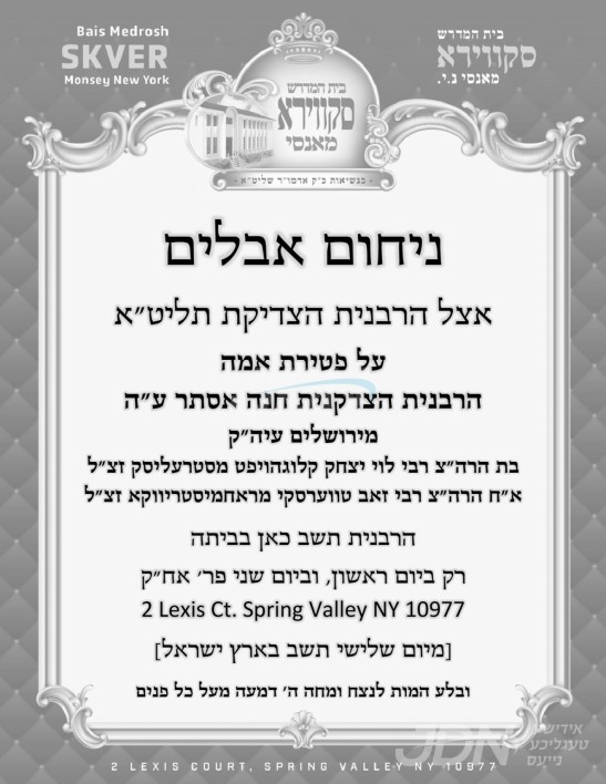 צו די פטירה פון הרבנית הצדיקת מרת חנה אסתר טווערסקי ע"ה, אלמנת הגה"צ ר' וועלוויל טווערסקי זצ"ל מראחמיסטריווקא, זיצן שבעה די בני המשפחה אין איר שטוב אויף רחוב חנה אין ירושלים, די קינדער הגה"צ ר' דוד טווערסקי שליט"א אבד"ק ראחמיסטריווקא בירושלים עיה"ק, הגה"צ ר' אלטר משה טווערסקי שליט"א אבד"ק ראחמיסטריווקא רמה ד' בית שמש, הרבנית אשת הגה"צ ר' מרדכי טווערסקי זצ"ל מראחמיסטריווקא, הרבנית תליט"א אשת חבר כ"ק אדמו"ר מנדבורנא ירושלים שליט"א, הרבנית אשת הגה"צ ר' אהרן גרינצווייג זצ"ל, הרבנית אשת הגה"צ ר' יהושע זעהוואלד שליט"א אבד"ק אלטשטאט, און הרבנית אשת הגה"צ ר' שמואל דוד שניאורסאן שליט"א משגיח ישיבת טשעבין.