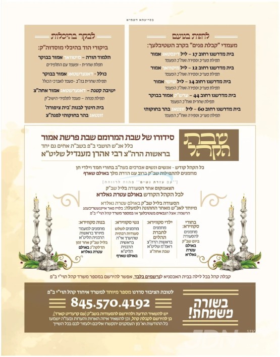 הונדערטער חסידי סקווירא תושבי בארא פארק גרייטן זיך אצינד מיטצולעבן א געהויבענע באזוך און א שבת התאחדות והתעלות, אין שפיץ פון הגה"צ ר' אהרן מענדיל טווערסקי שליט"א בנו הגדול פון כ"ק אדמו"ר מסקווירא שליט"א, וועלכער וועט אפשטאטן א באזוך פון א פולע וואך בקרב חסידי סקווירא אין בארא פארק, און באזוכן אין אלע אפטיילונגען פון די קהילה און מוסדות בתוככי העיר.